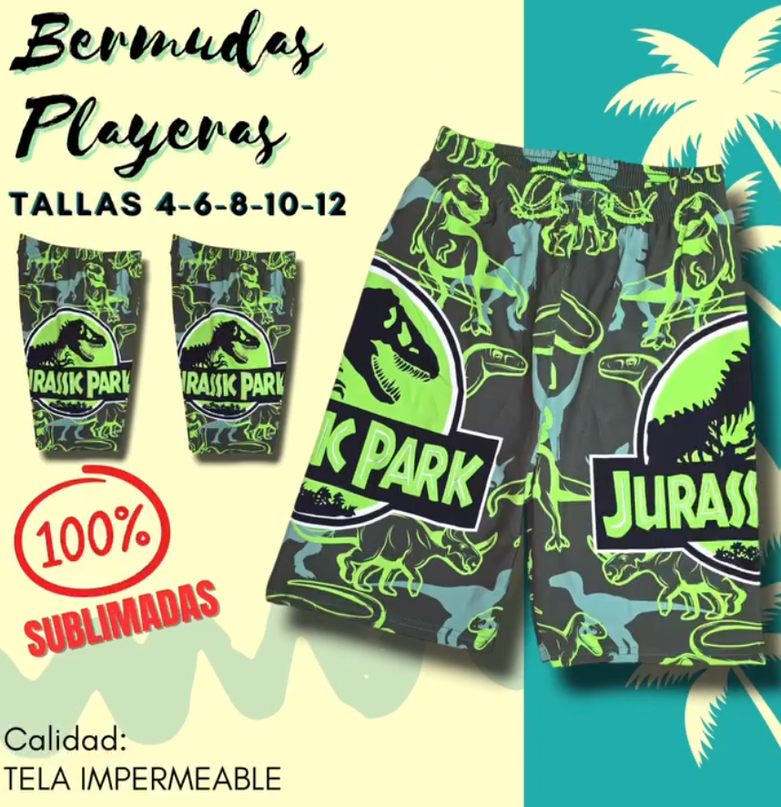 ¡Explora la aventura con estilo! Estas bermudas playeras 100% sublimadas combinan diseño vibrante y funcionalidad. Con estampado exclusivo de Jurassic Park, cada prenda presenta ilustraciones de dinosaurios en tonos verdes y azules, junto al icónico logo en ambas piernas.